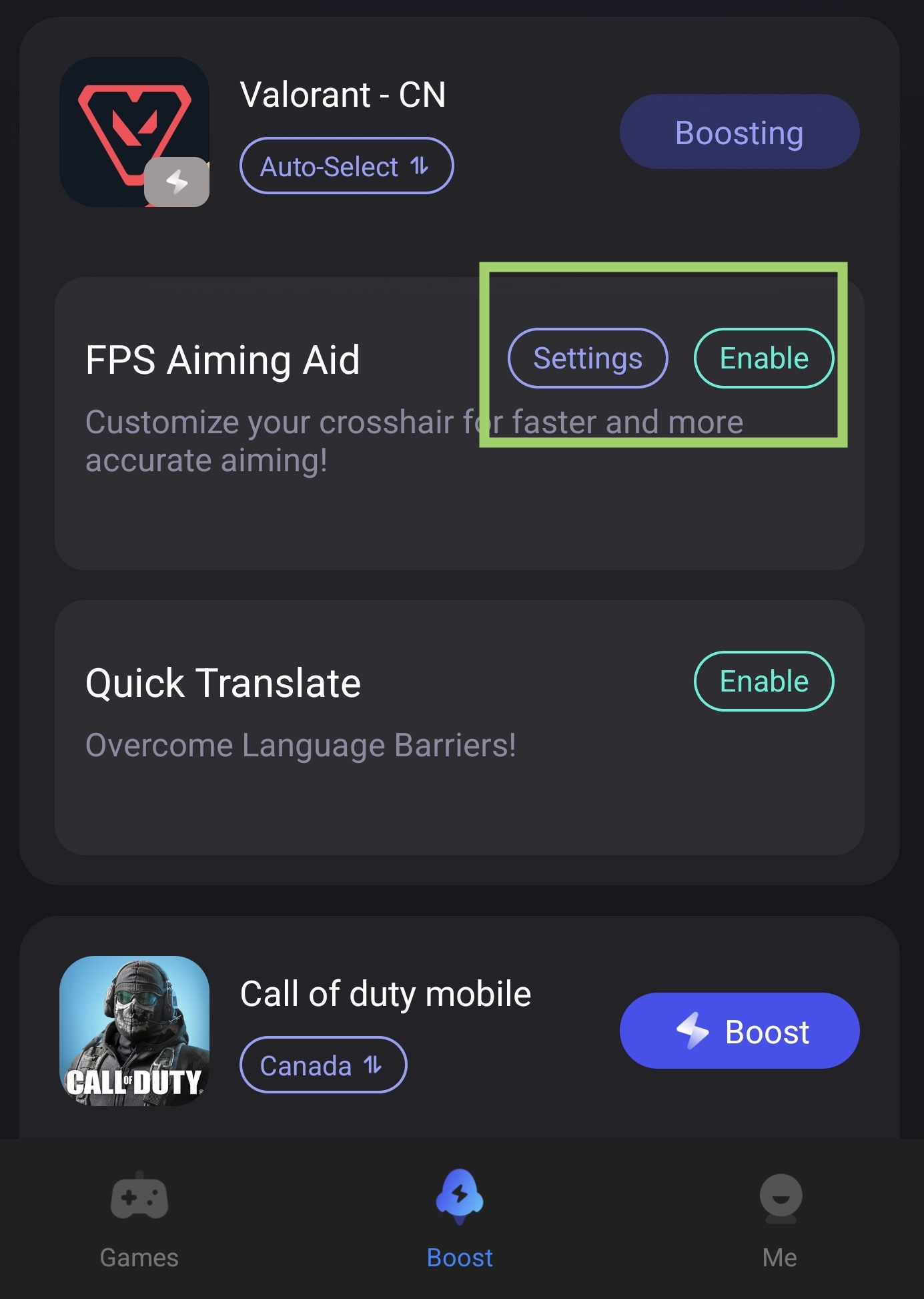 Во вкладке Boost найди "FPS Aiming Aid" под Valorant CN. Нажми Enable, чтобы включить прицел.