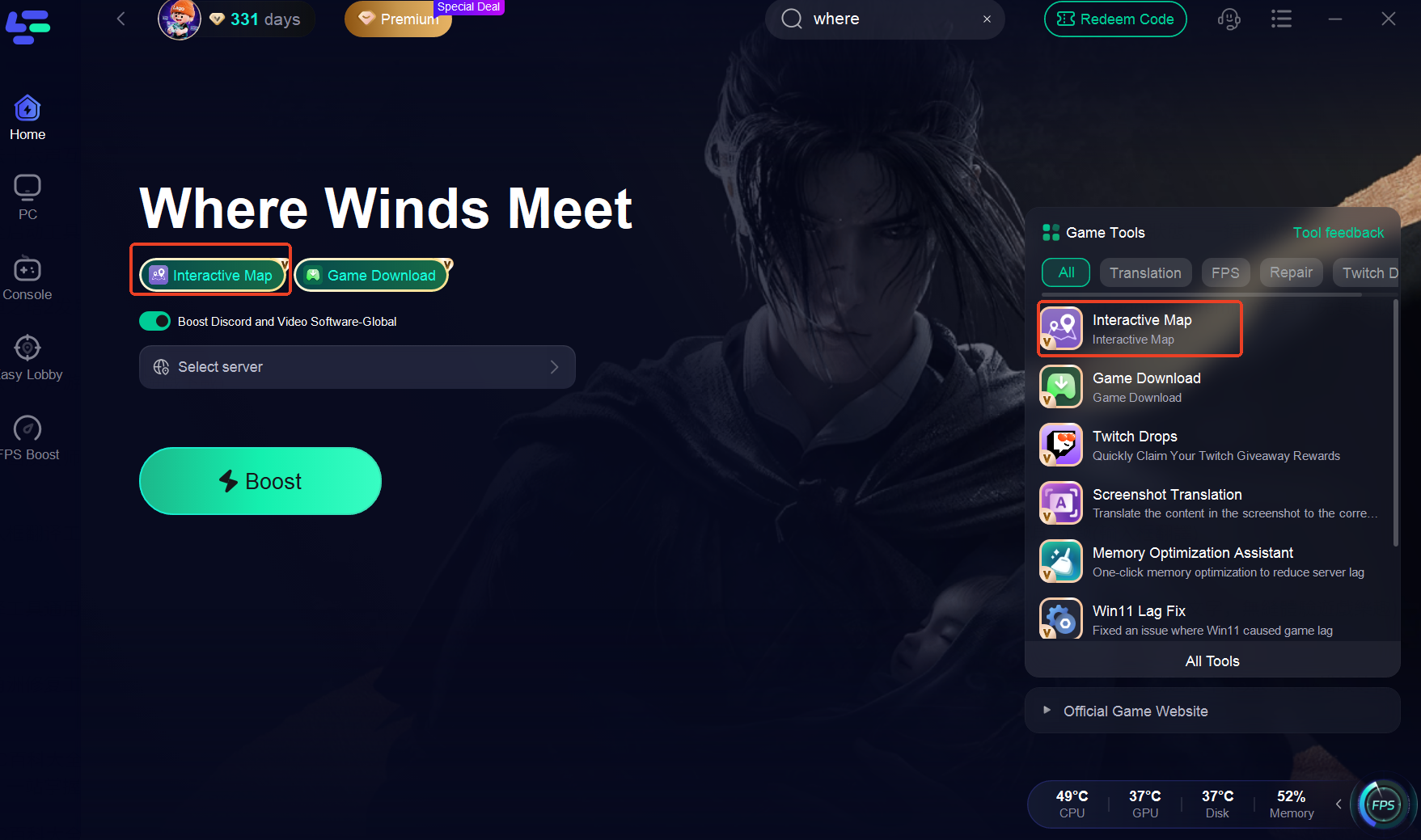 На странице Where Winds Meet внутри LagoFast нажмите Интерактивная карта, чтобы открыть полную карту мира.