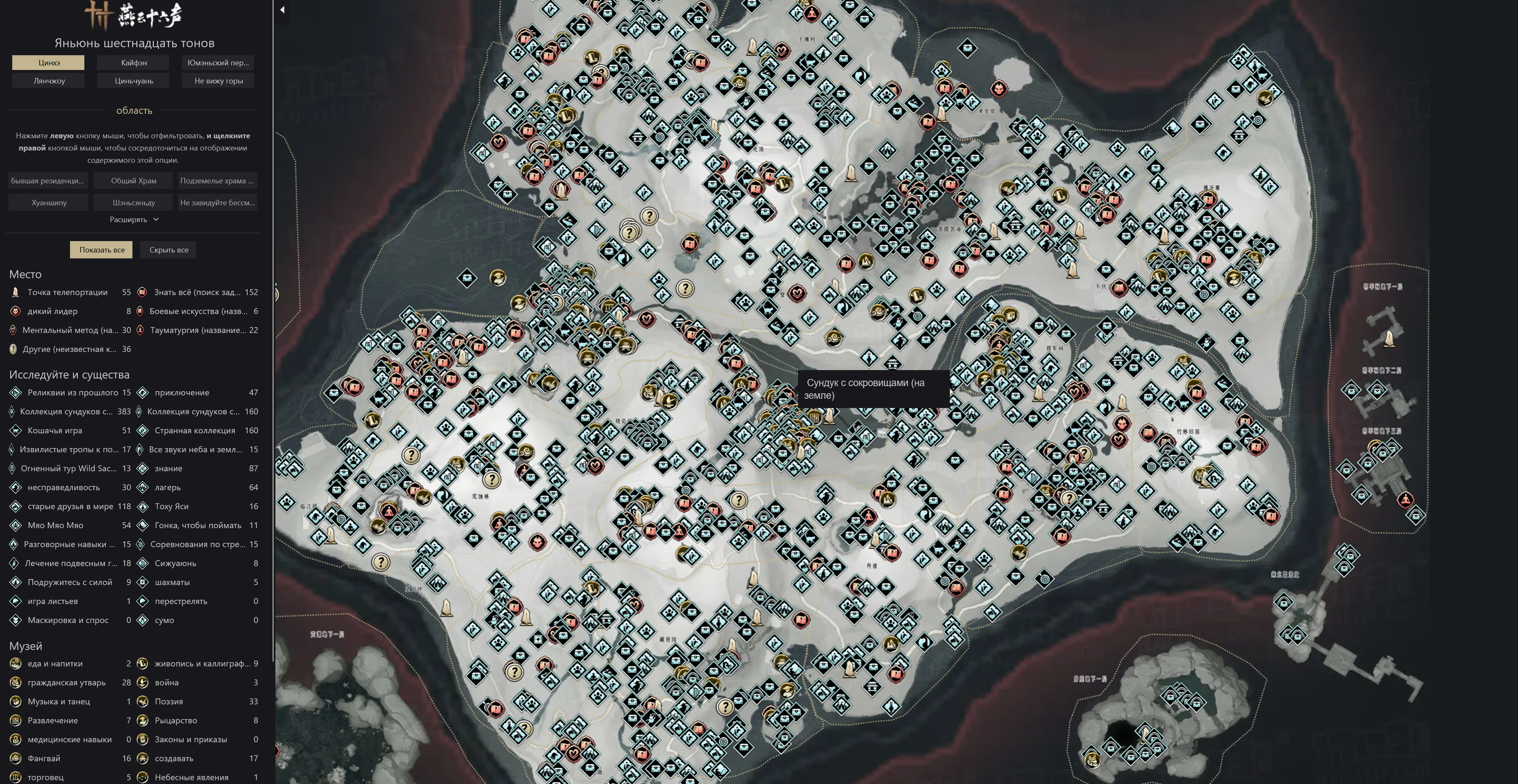 Укажите регион, в котором вы играете (например, Цинхэ), затем включите нужные категории — например, Сундуки, Диковинки, Мини-игры или Боссы.