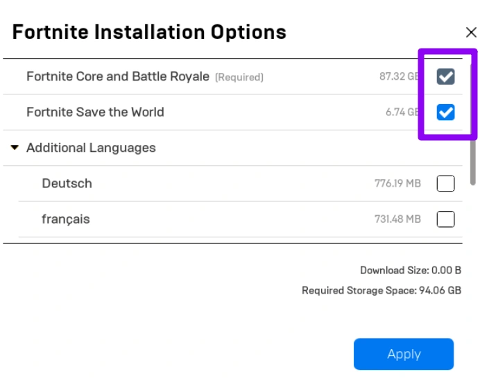 Шаг 4. Убедитесь, что флажок рядом с Fortnite Save the World установлен. Если он уже установлен, снимите его, нажмите Apply, а затем снова установите, чтобы принудительно запустить новую загрузку файлов STW.