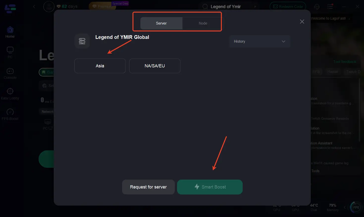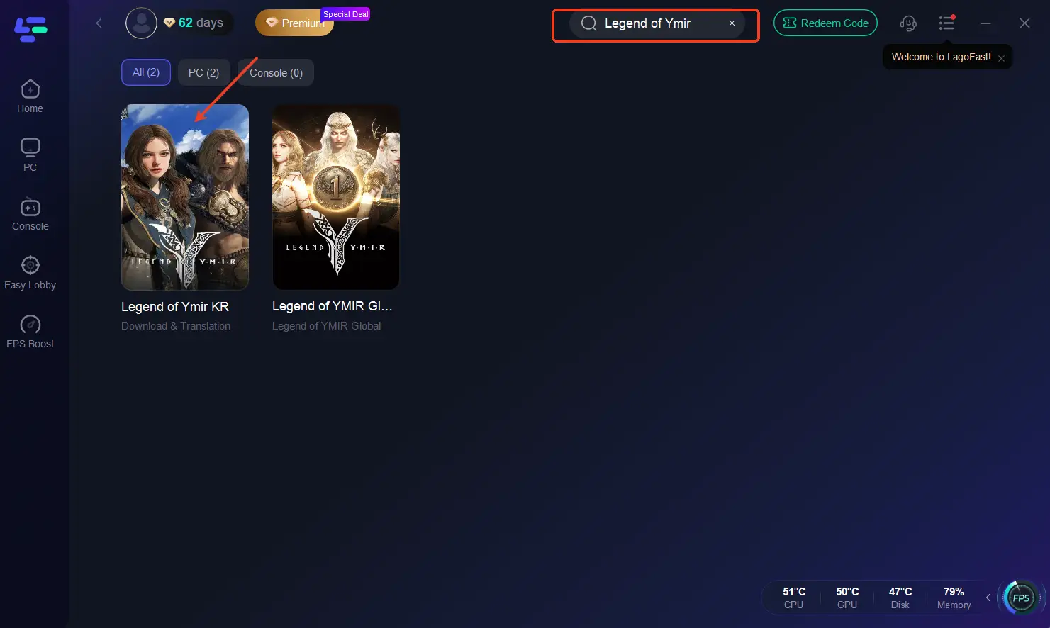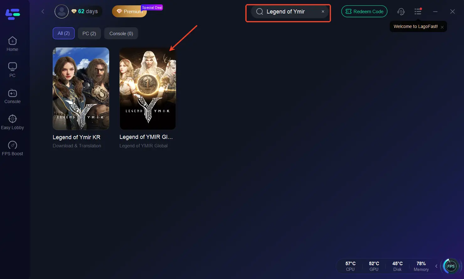 Шаг 1. Откройте LagoFast и введите “Legend of Ymir Global” в строке поиска.