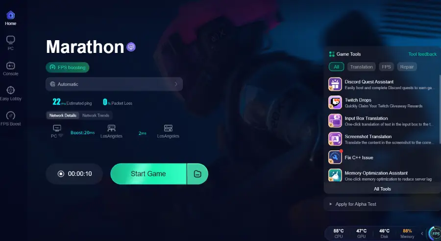Если ваши сессии Marathon вылетают, зависают или застревают на экранах загрузки из-за нестабильного соединения, проблема может быть не в железе — это может быть нестабильная маршрутизация или потеря пакетов. Вместо того чтобы бороться с провайдером, можно оптимизировать путь соединения напрямую. Именно здесь помогает LagoFast.