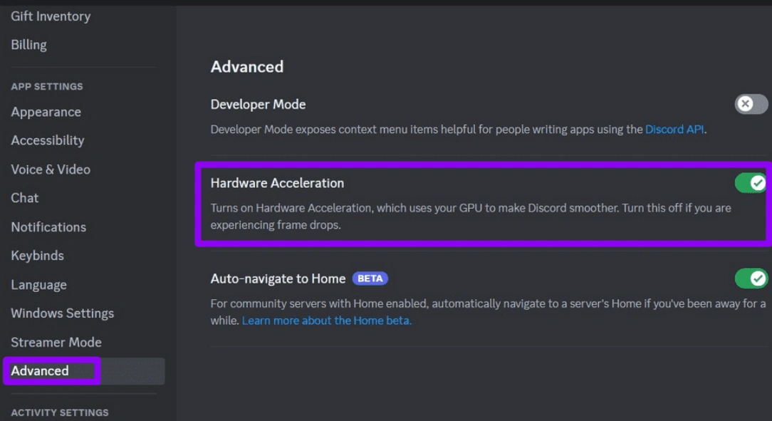 Решение для ПК 3: Отключить аппаратное ускорение в Discord