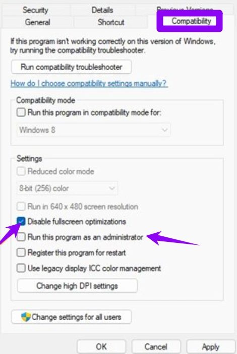 Шаг 4: Установите флажок «Disable fullscreen optimizations».